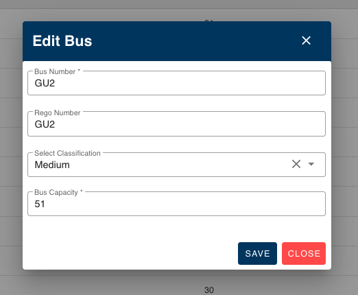 - At Edit bus screen, update the bus information where needed then select the Save button to save your changes.