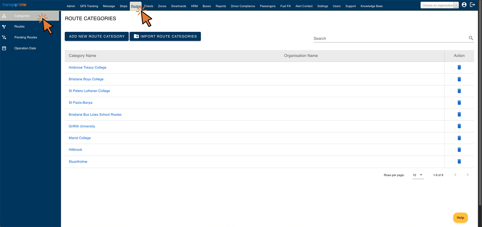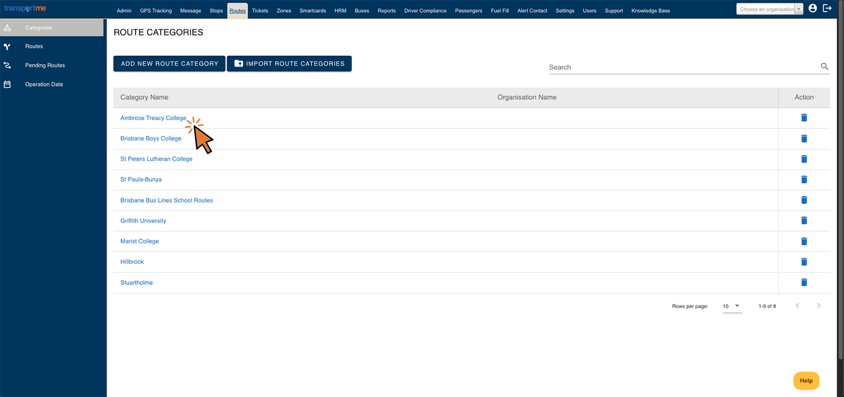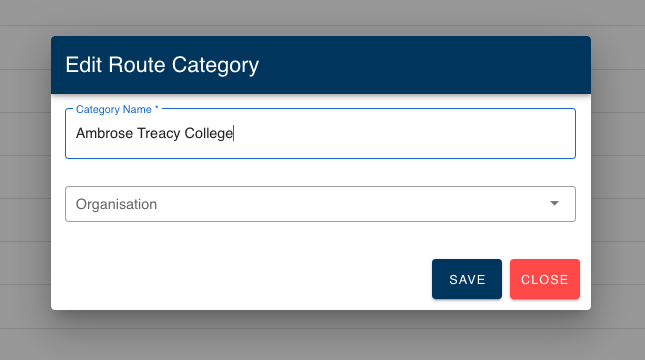 - Update route category name and/or organisation, then select the Save button to apply the changes.