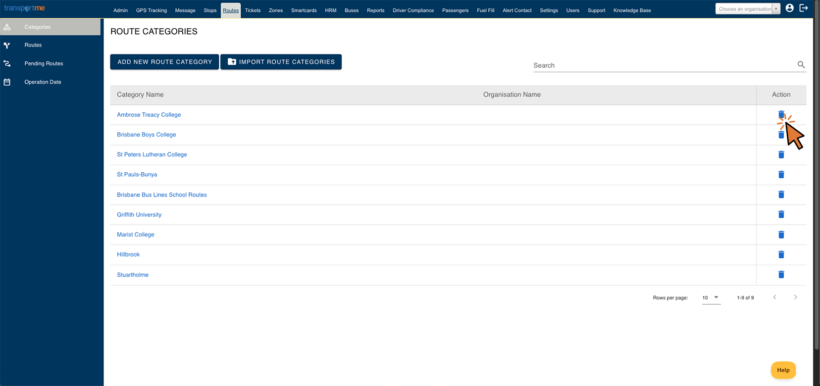 Locate the route category that is going to be deleted using the Search bar, and then select the trashbin icon. Confirm the action to remove the route category from your system.