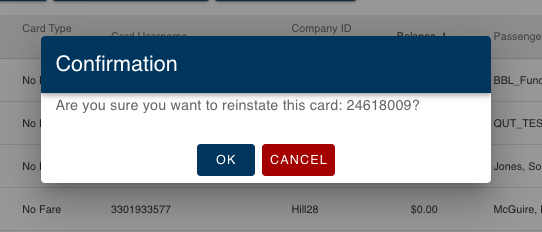 - A pop-up box will appear to confirm the reinstatement of the smartcard. Select OK to restore the smartcard, or select Cancel to abort the process.