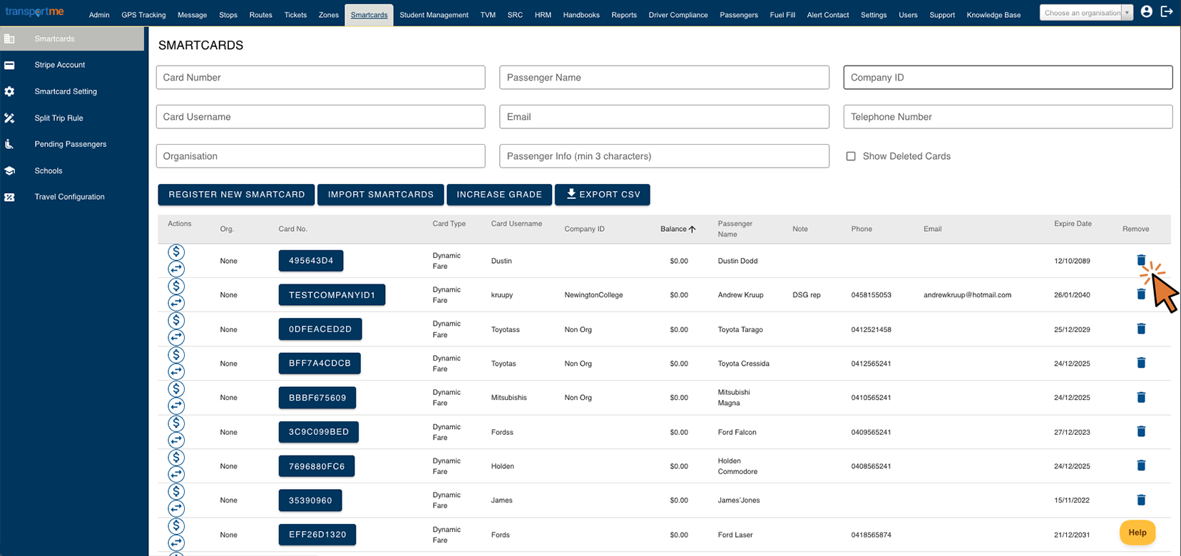 - Smartcards screen example for Transportme™ operators.