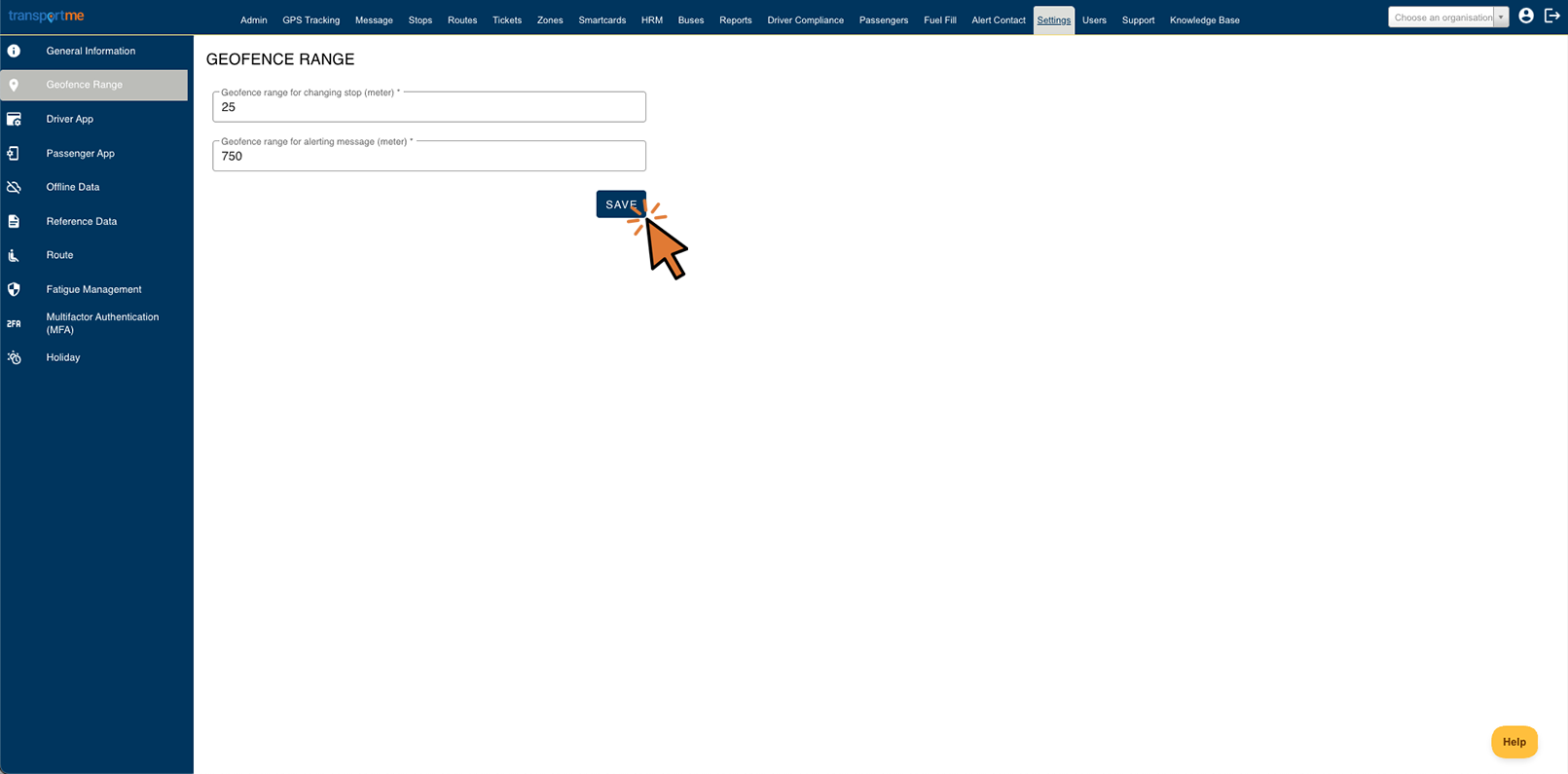 Geofence range for changing stop (meter): when the bus arrives at geofence of a stop, the Driver app’s current stop will be changed to that stop.