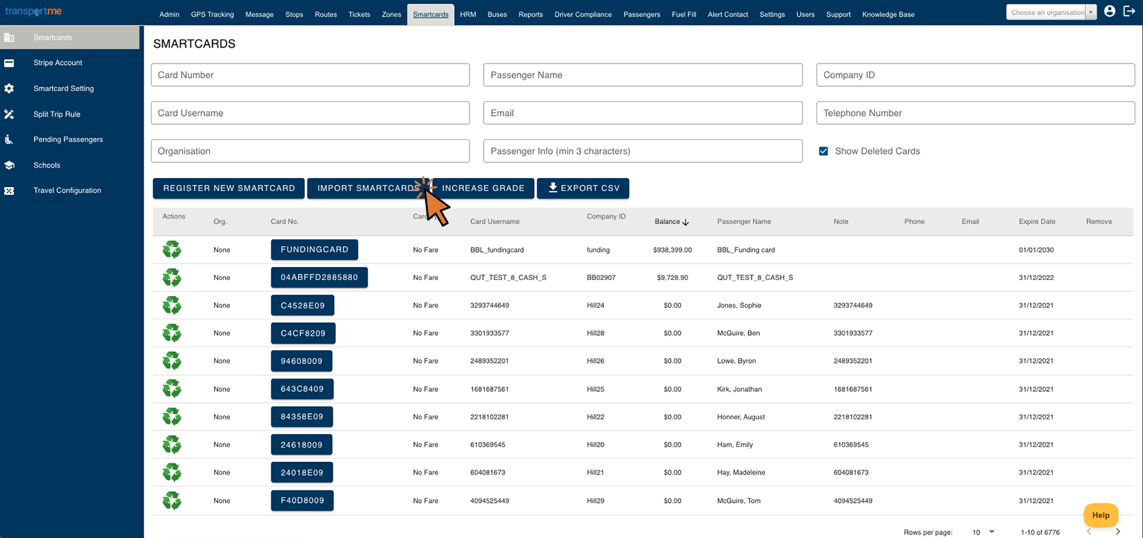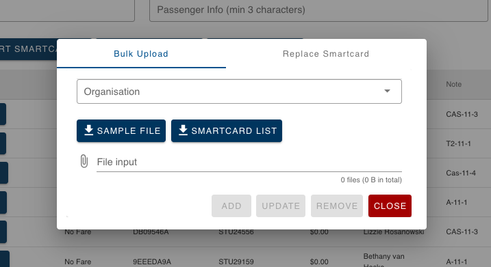 - Step 1: Select the Smartcard list button to download the smartcard list. This file contains a comprehensive list of all active smartcard profiles in the system available for operators to update. If you intend to update smartcards associated with an organisation, please select the desired organisation from the Organisation dropdown list prior to downloading the smartcard list.