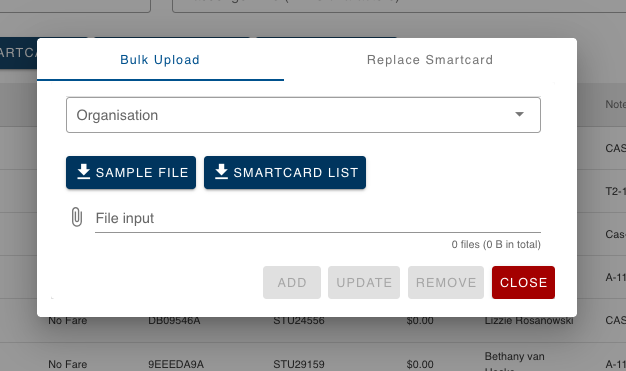 - Step 1: Select the Smartcard list button to download the smartcard list. This file contains a comprehensive list of all active smartcard profiles in the system available for operators to delete. If you intend to delete smartcards associated with an organisation, please select the desired organisation from the Organisation dropdown list prior to downloading the smartcard list.
