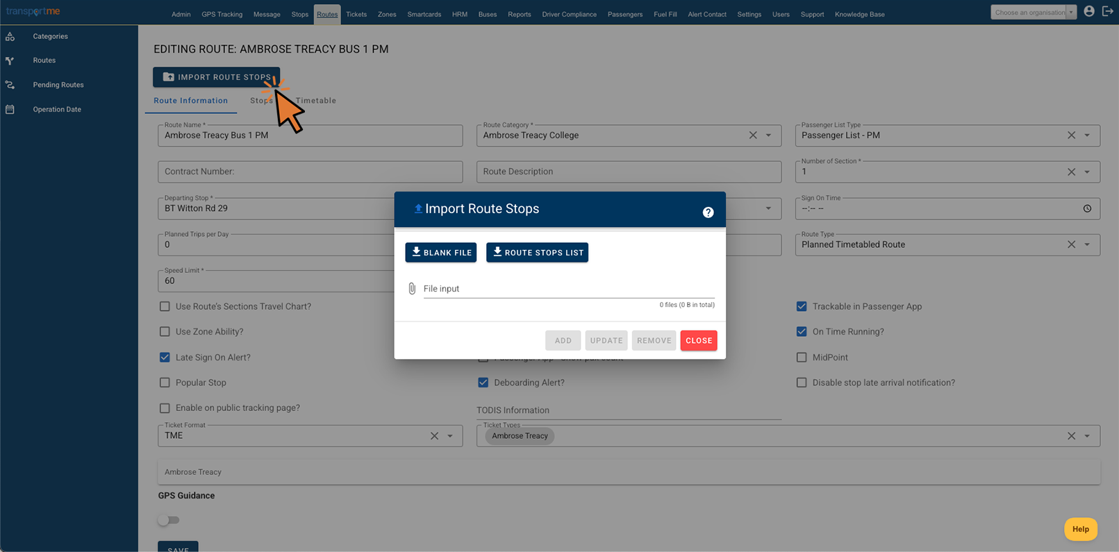 For the portal sync of Route Stops, routes and stops must be added to the system in advance.