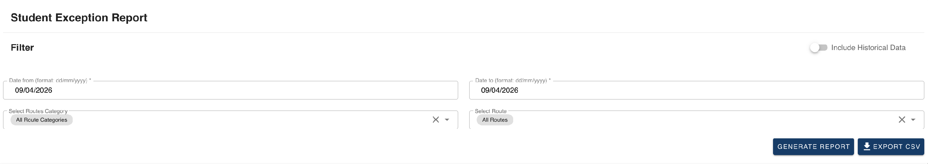 I expected to see a route but it's not showing up. Check whether "Include Historical Data" is ticked — the route or its stops may have been deactivated. Also confirm the date range covers the period when that route was running.