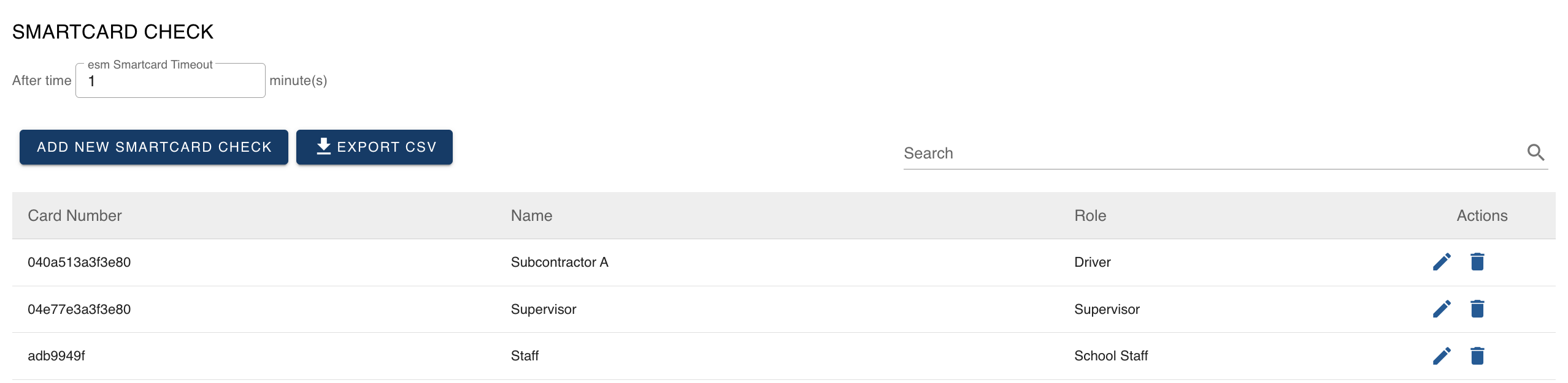- Click ADD NEW SMARTCARD CHECK button to create new driver, supervisor, or school staff entry. Enter the required details, including the smartcard number that will be used to tap on the route and verify the bus before ending the route.